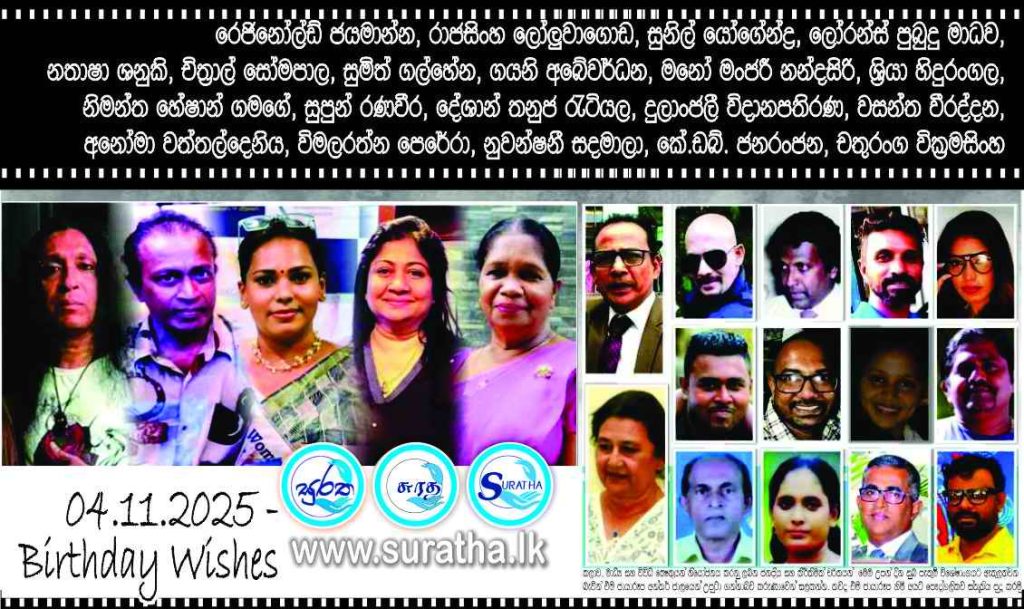 අද දින උපන් දිනය සමරන මනෝරා ප්‍රේමතිලක, මොනිකා පුෂ්පකුමාරි, ඩී.කේ. ආටිගල, දිලානි මධුරසිංහ, මොහාන් හෙට්ටිආරච්චි, ශිරෝමිකා ප්‍රනාන්දු, මහේෂ් ජයසිංහ, තනූජා ජයවර්ධන, සිතුම් සුධාර, ලක්ශ්‍රීයා ගුණසේන, ජගත් රාමනායක, අසංක ප්‍රභාත් සෙනෙවිරත්න ඇතුඵ සියඵම කලාකරුවන්, මධ්‍යවේදින් සහ සකලවාසී සැමට සුරත මාධ්‍ය ජාලයේ සුභ පැතුම්…