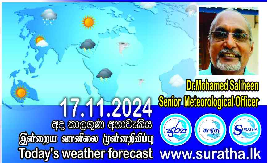 අද කාලගුණය 2024.11.17 බස්නාහිර, මධ්යම, සබරගමුව, දකුණ, ඌව සහ වයඹ පළාත්වල සවස් කාලයේදී හෝ රාත්රී කාලයේදී…