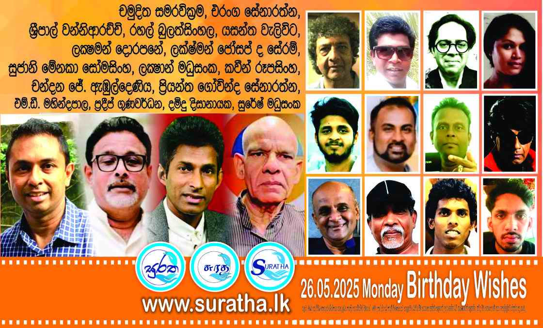 අද දින උපන් දිනය සමරන චමුදිත සමරවික්රම, එරංග සේනාරත්න, ශ්රීපාල් වන්නිආරච්චි, රහල් බුලත්සිංහල, යසන්ත වැලිවිට, ලක්ෂමන් දොරපනේ, ලක්ෂ්මන් ජෝසප් ද සේරම්, සුජානි මේනකා සෝමසිංහ, ලක්ෂාන් මධුසංක, කවීන් රූපසිංහ, චන්දන ජේ. ඇඹුල්දෙණිය, ප්රියන්ත ගෝවින්ද සේනාරත්න, එම්.ඩී. මහින්දපාල, ප්රදීප් ගුණවර්ධන, දමිදු දිසානායක, සුරේෂ් මධුසංක ඇතුඵ සියඵම කලාකරුවන්, මධ්යවේදින් සහ සකලවාසී සැමට සුරත මාධ්ය ජාලයේ සුභ පැතුම්…