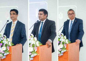 (Standing from left to right) Dr. Dayan Rajapakse, Chairman and Group Managing Director of ESOFT Metro Campus and ESU; Mr. Nishan Sembacuttiaratchy, CEO of ESOFT Metro Campus & ESU and Director of ESOFT International – Singapore; and Prof. Mukesh Limbachiya, Faculty Director – Strategic Partnering and Development at Kingston University London, addressing the audience at the ESU Colombo launch.