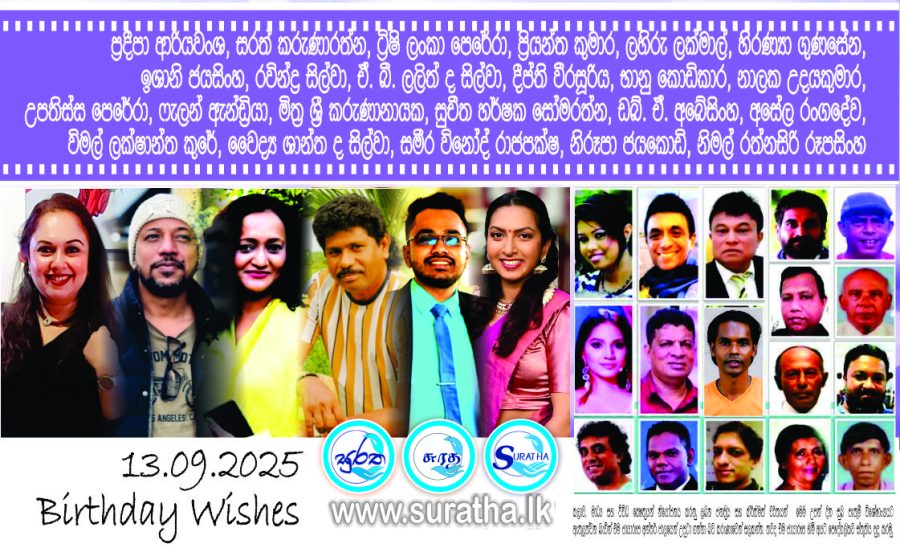 අද දින උපන් දිනය සමරන ප්රදීපා ආරියවංශ, සරත් කරුණාරත්න, ටි්රෂි ලංකා පෙරේරා, ප්රියන්ත කුමාර, ලහිරු ලක්මාල්, හිරණ්යා ගුණසේන, ඉශානි ජයසිංහ, රවින්ද්ර සිල්වා, ඒ. බී. ලලිත් ද සිල්වා, දීප්ති වීරසූරිය, භානු කොඩිකාර, නාලක උදයකුමාර, උපතිස්ස පෙරේරා, ෆැලන් ඇන්ඩි්රයා, මිත්ර ශ්රී කරුණානායක, සුචීත හර්ෂක සෝමරත්න, ඩබ්. ඒ. අබේසිංහ, අසේල රංගදේව, විමල් ලක්ෂාන්ත කුරේ, වෛද්ය ශාන්ත ද සිල්වා, සමීර විනෝද් රාජපක්ෂ, නිරූපා ජයකොඩි, නිමල් රත්නසිරි රූපසිංහ ඇතුඵ සියඵම කලාකරුවන්, මධ්යවේදින් සහ සකලවාසී සැමට සුරත මාධ්ය ජාලයේ සුභ පැතුම්…