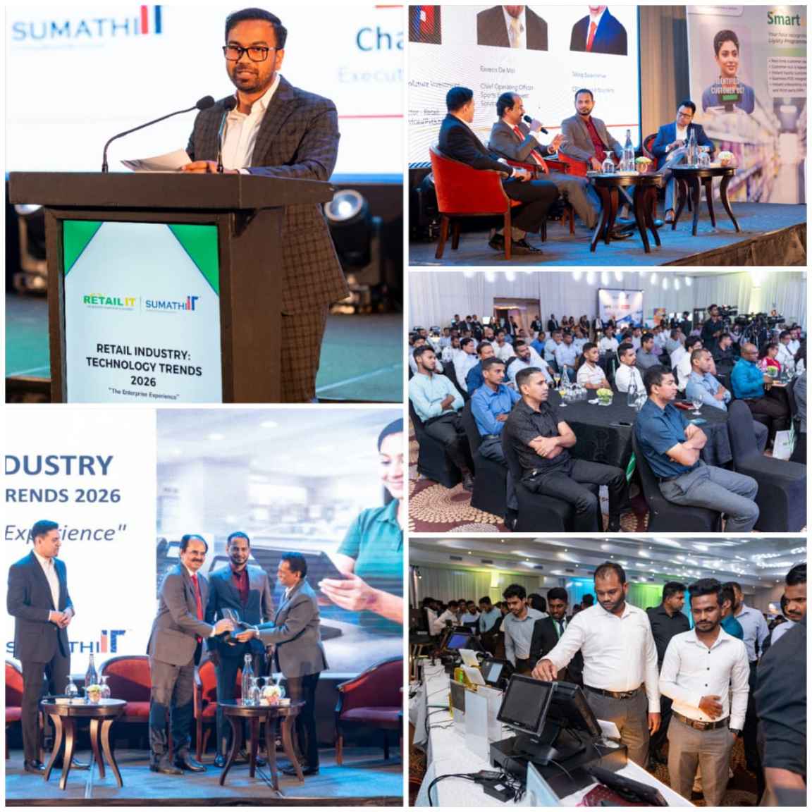 Top left: Chadu Sumathipala, Executive Director – Sumathi Holdings, delivering the opening address, top right: industry leaders in discussion on enterprise integration, data-driven decision-making and operational resilience; centre right: retail and enterprise stakeholders in attendance; bottom left: the official Sri Lankan launch of Adler ERP; bottom right: live demonstrations of integrated POS and face recognition–based loyalty technologies, translating strategy into practical, enterprise-ready solutions.